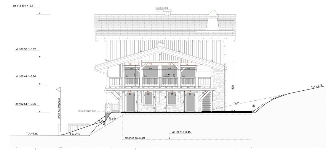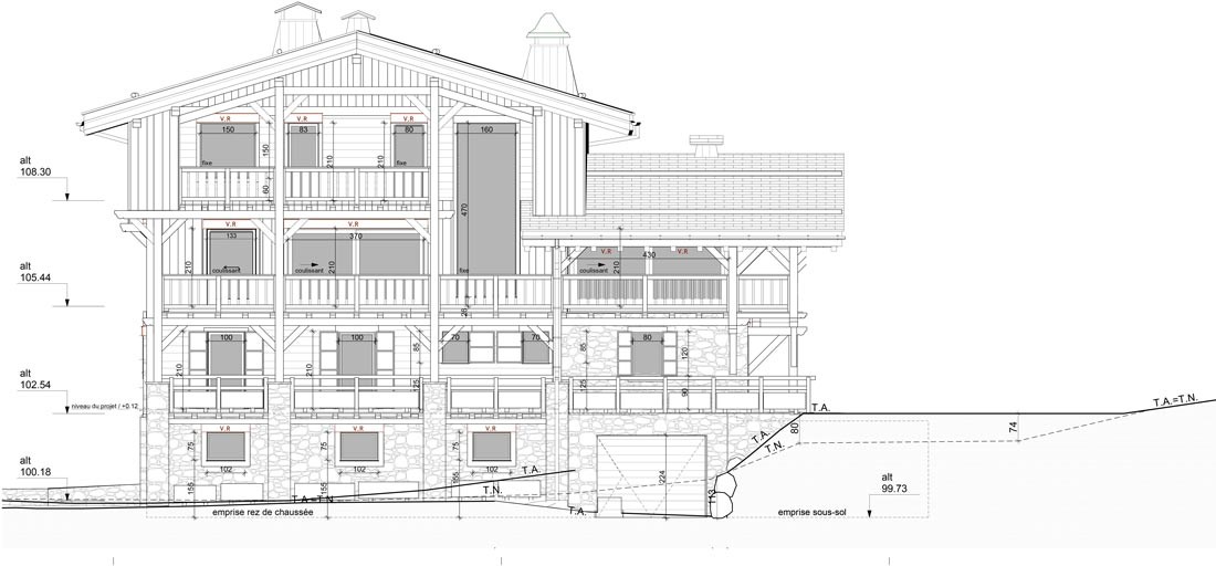 Le projet consiste en la rénovation d'un ancien chalet : restructuration et extension de celui-ci dans le but de réaliser un chalet individuel sur 4 niveaux. Le changement a pour effet la modification des ouvertures de la façade Nord et de la façace Ouest. Seules deux des quatre façades du projet seront modifiées. Les ouvertures sont modifiées ainsi que la modénature, telle que les habillages extérieurs, le sens du bardage, les volets et les garde corps des balcons. Les matériaux utilisés seront conservés. L'apport de pierre murale par endroits et l'implantation des trois poteaux vont modifier l'emprise au sol générale du bâtiment. Le sous-sol sera agrandi en façade Est en en façade Ouest.